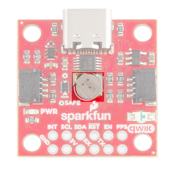 The small metal disk opposite of the Qwiic connector is a small lithium battery. This battery does not provide power to the IC like the 3.3V system does, but to relevant systems inside the IC that allow for a quick reconnection to satellites. The time to first fix will about ~29 seconds, but after the product has a lock, that battery will allow for a one second time to first fix. This is known as a hot start and lasts for four hours after the board is powered down. The battery provides over a years worth of power to the backup system and charges slowly when the board is powered.