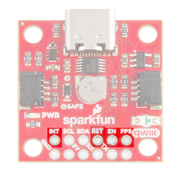 There are four other pins broken out: Pulse per second PPS, Reset RST, Safeboot SAFE, and finally the interrupt pin INT. The first pin PPS outputs pulse trains synchronized with the GNSS or UTC time grid. The signal defaults to once per second but is configurable over a wide range. Read the u-blox Receiver Protocol Specification in the Resources tab for more information. The reset pin resets the chip. The next pin, SAFE is used to start up the IC in safe boot mode. The final pin INT can be used to wake the chip from power save mode.