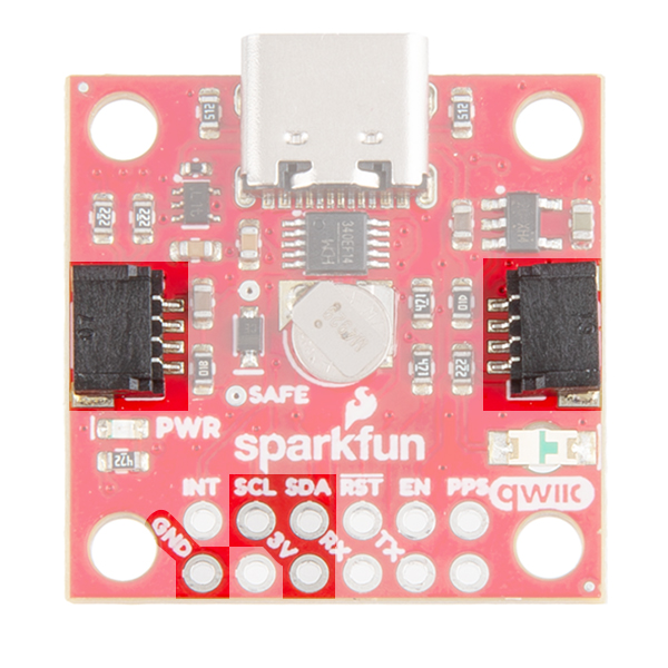 At the opposite side of the board. There are two pins labeled SDA and SCL which indicates the I2C data lines. Similarly, you can use either of the Qwiic connectors to provide power and utilize I2C. The Qwiic ecosystem is made for fast prototyping by removing the need for soldering. All you need to do is plug a Qwiic cable into the Qwiic connector and voila!